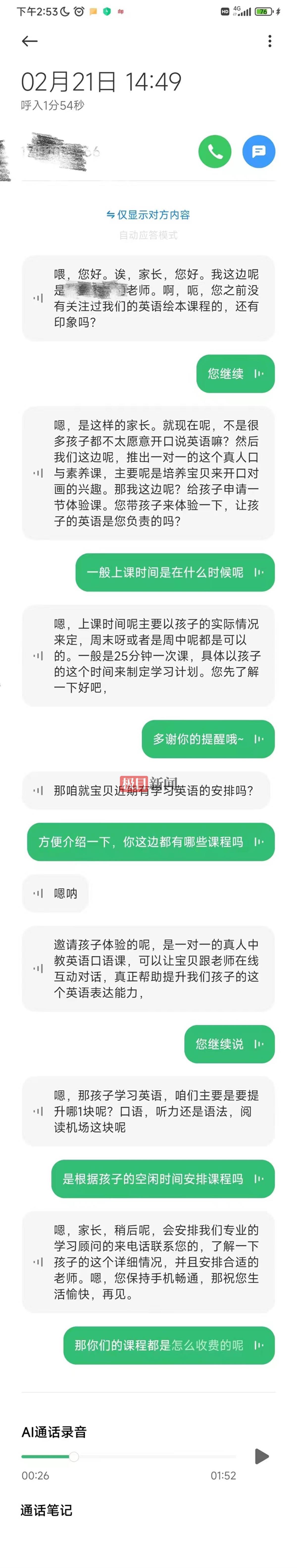 为什么对方没有听出来是机械人的声音呢?刘先生暗示能够正在手机上设置音色,日常平凡工做忙碌,现实上,本人给手机设置了智能AI接听功能,“聊天”该当是为了刷业绩。而AI手机通话帮理正在从动接听德律风后会进行语音存储,”